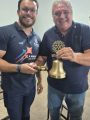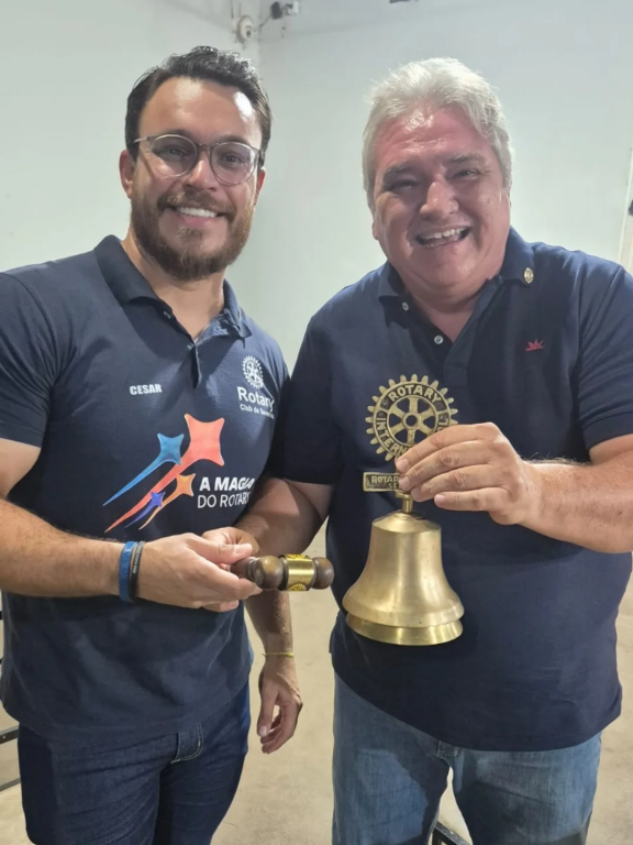A imagem mostra três indivíduos próximos uns dos outros, segurando um martelo. A pessoa no centro segura o martelo com as duas mãos, enquanto os indivíduos de cada lado ajudam. A pessoa à esquerda está usando uma camisa polo escura com logo e texto, e a da direita usa uma blusa clara sem mangas. Uma mesa é visível em primeiro plano com um sino e um livro sobre ela. O cenário parece ser interno, possivelmente em um evento ou reunião. A postagem no Instagram é da conta \"rotary4480\", e a legenda menciona uma visita ao Rotary Club de Severínia para a entrega do martelo, com referências a Rosangelaine e ao governador Lelo Maset.
