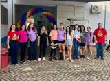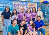 Cinco mulheres e 2 homens, agachados na calçada e na frente de uma grade onde uma grande faixa informando sobre a campanha dia D multivacinação.