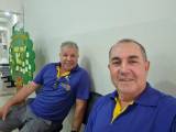 Um homem lado esquerdo, de camiseta azul do Rotary faz uma self
