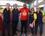 3 homens e uma mulher de camiseta azul com manga e gola amarela do Rotary, junto uma criança de roupa rosa.