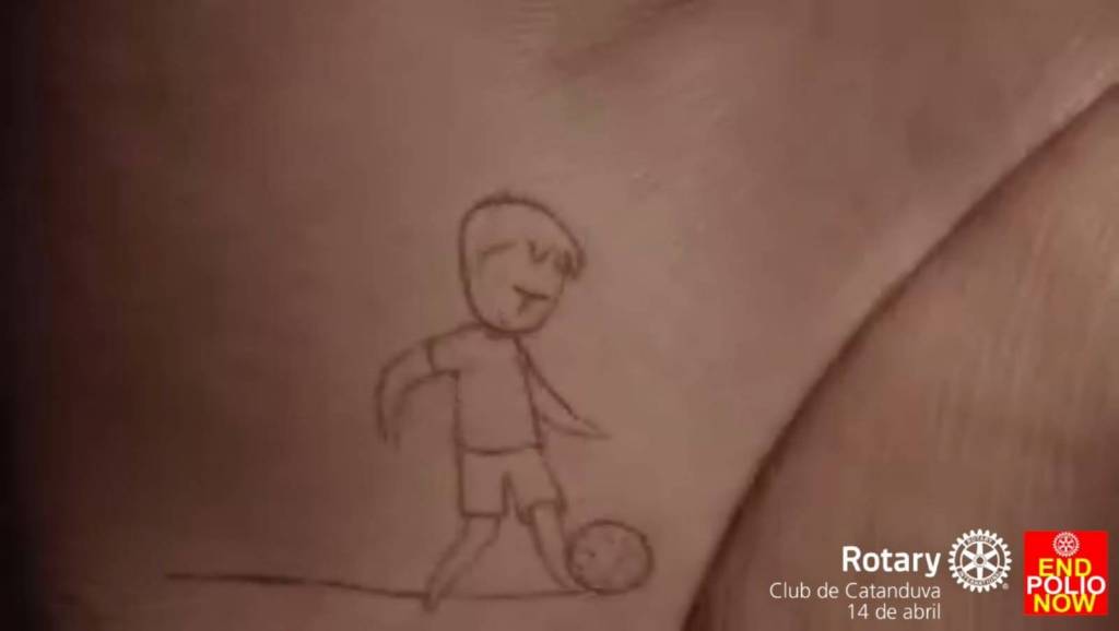 Um vídeo no lado direito inferior o logo do Rotary Club de Catanduva 14 de abril e logo da end pólio Now. O video mostra as 2 mãos com a palma para cima e a figura contornada de um menino aparece. Ele jogando bola, brincando entre as linhas da palma da mão.