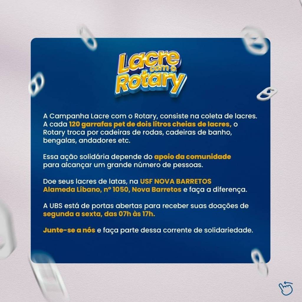 Audiodescrição: no card de fundo azul com alguns lacres de latinhas desenhados e soltos coo se estivessem jogados no ar, no título - Lacre com o Rotary. Do lado direito um desenho de um menino sentado em uma cadeira de rodas. Do lado esquerdo, Seu lacre ajuda vidas! Ponto de doação: USF Nova Barretos, Alameda Líbano, 1050 Nova Barretos.