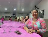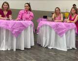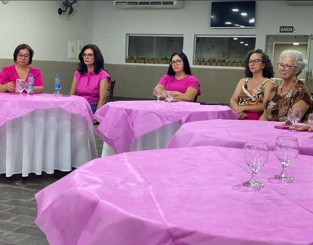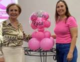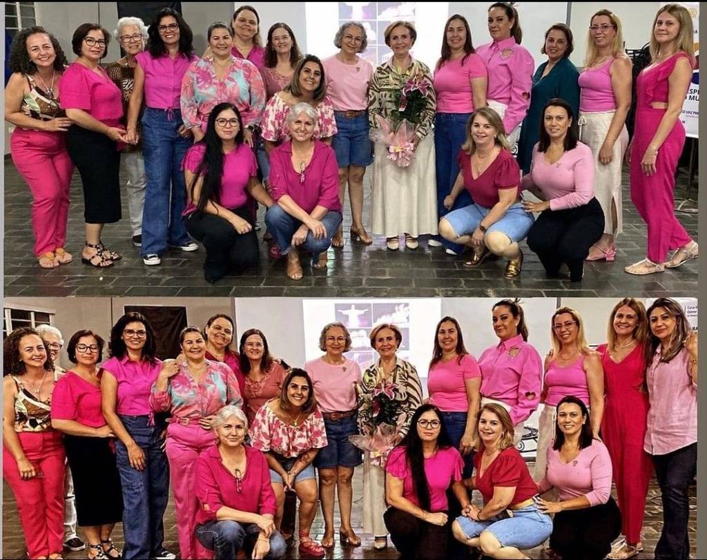Audiodescrição: na foto várias mulheres identificadas, umas em pé e outras agachadas, todas posando para foto, sorridentes, vestindo roupas rosas ou em tons de rosa. No título, Palestra: Menopausa Sem Sofrimento.