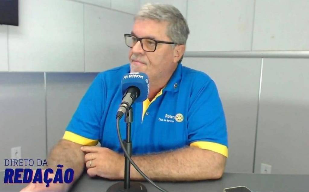 Rapaz de cabelos claros, de óculos, em um estúdio, sentado atrás de uma mesa com um microfone na sua frente. Ele veste uma camisa estilo Pólo do Rotary Club de Barretos e no canto inferior esquerdo está escrito "Direto da Redação"