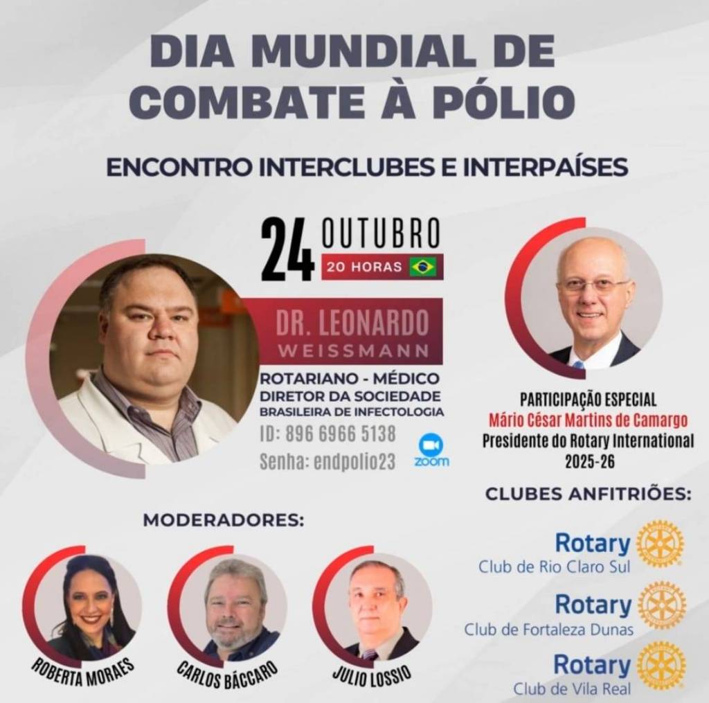 A imagem é um cartaz de um evento chamado "Dia Mundial de Combate à Pólio". O evento é um encontro interclubes e interpaises que acontecerá no dia 24 de outubro às 20 horas. O cartaz apresenta fotos de quatro pessoas. Na parte superior, há uma foto de um homem chamado Dr. Leonardo Weissmann, que é rotariano e médico, e também diretor da Sociedade Brasileira de Infectologia. Há também uma foto de um homem mais velho, careca e de óculos chamado Mário César Martins de Camargo, que é o Presidente do Rotary International para os anos 2025-26. Na parte inferior, há fotos de três pessoas que serão os moderadores do evento: Roberta Moraes, Carlos Baccaro e Julio Lossio. O cartaz também mostra que o evento será realizado via Zoom com ID: 896 6966 5138 e senha: endpolio23. Além disso, há logos do Rotary Club e nomes de clubes anfitriões, que são Club de Rio Claro Sul, Club de Fortaleza Dunas e Club de Vila Real