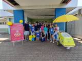 Grupo de pessoas, homens, mulheres e crianças de variadas idades na frente de um posto de saúde. Uma das crianças segura bexigas amarelas e azuis. Do lado esquerdo da foto há um banner vermelho da campanha "End Polio Now" e do lado direito, um carrinho de sorvete com um guarda-sol. Ambos são amarelos.