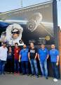 6 homens e 1 mulher identificados na frente de um painel, com um astronauta e um satélite no espaço sideral em destaque.
