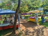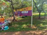 Uma praça arborizada com uma faixa da campanha End Polio Now ao centro. A parte de cima da faixa em amarelo, com logo rotário, crianças do lado esquerdo e o logo da End pólio Now do lado direito. Na parte de baixo em roxo. Não é possível identificar o que está escrito.