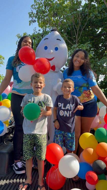 Grupo com muitas pessoas em um local coberto com um palco, onde as pessoas se reuniram. No centro, uma pessoa vestida de Zé Gotinha segura um banner vermelho da End Polio Now.