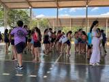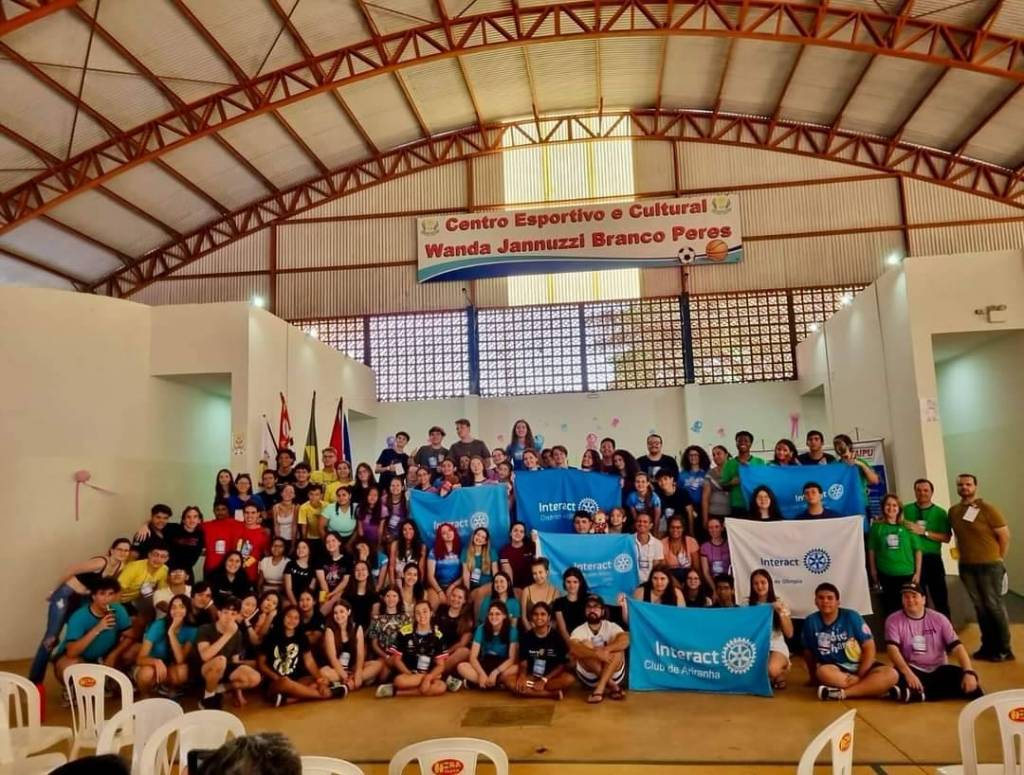 Audiodescrição: na foto, imagem de um ginásio de esportes, No teto, uma faixa escrito Centro Esportivo e Cultural Wanda Jannuzzi Branco Peres, com desenho de uma bola de futebol e outra de basquete. Abaixo, a estrutura do ginasio com janelas vazadas em alvenaria, nas laterais aberturas de com se fossem portas, e na frente da foto, inúmeros jovens em pé e sentados, alguns seguram umas bandeiras do Interact Club de Itapolis, todos parecem felizes,do lado esquerdo, atras de alguns jovens, um pavilhão de bandeiras. Na frente identifica-se algumas cadeiras brancas plásticas.