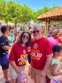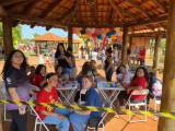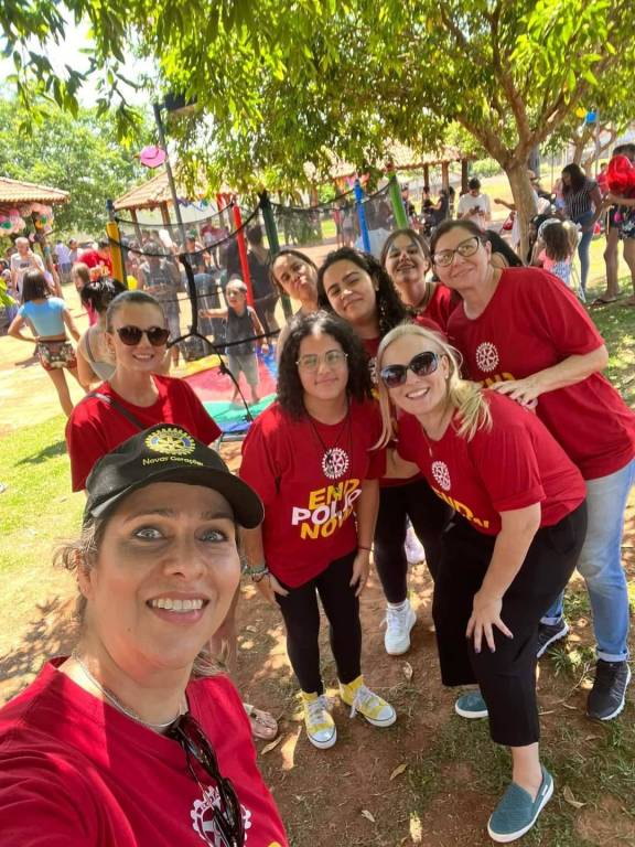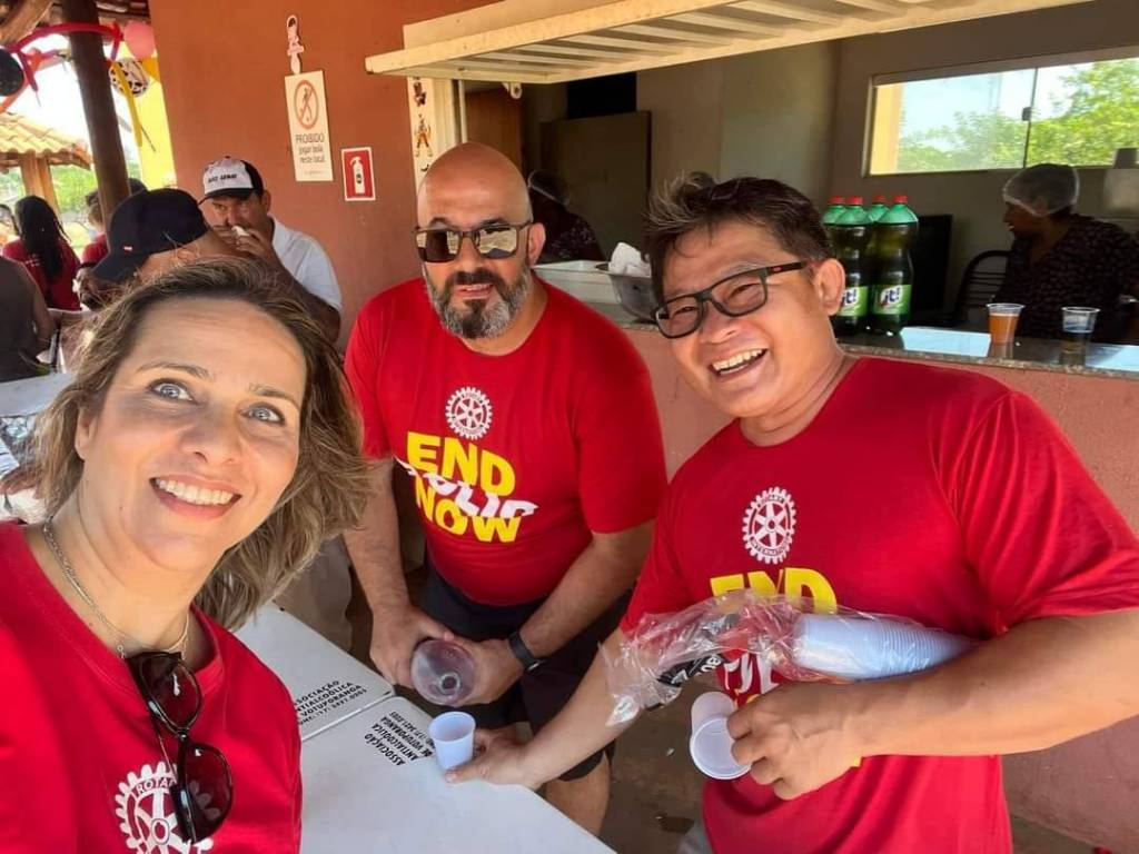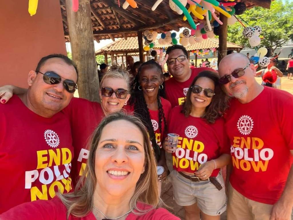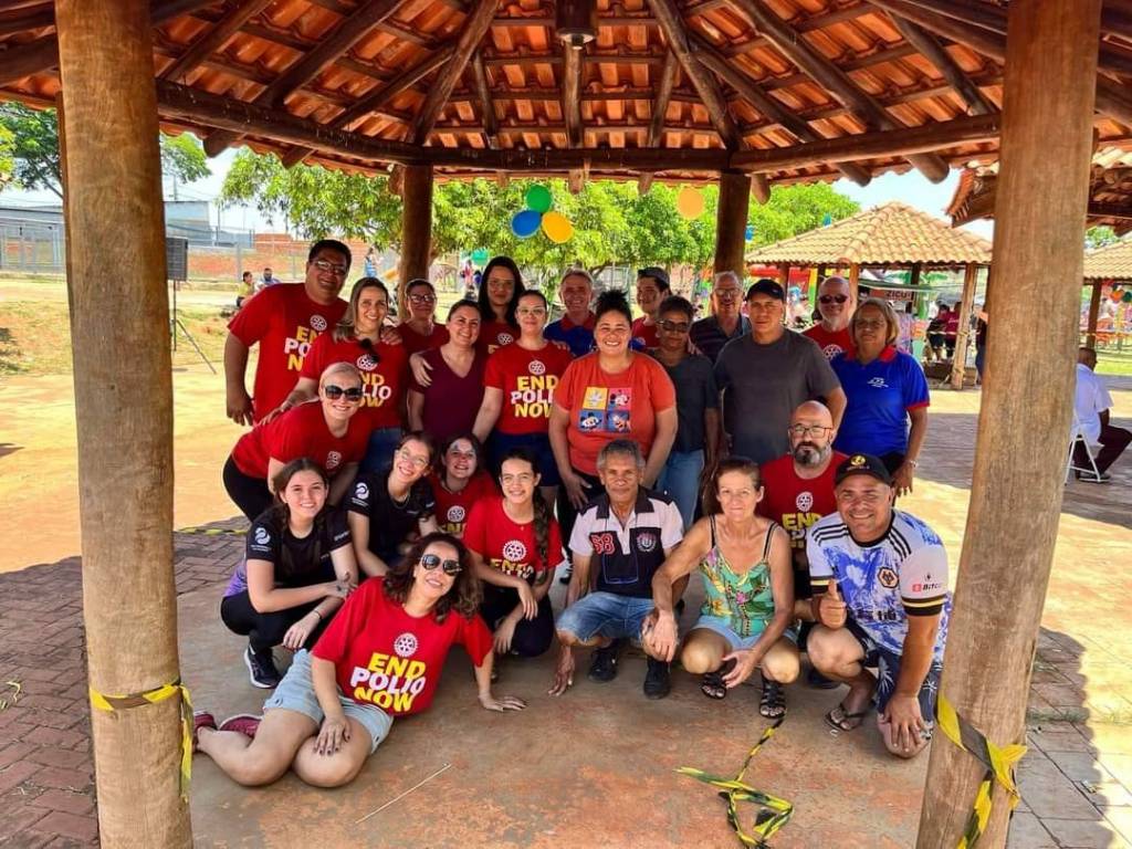 Audiodescrição: na foto, várias pessoas identificadas, todas posando para foto, sorridentes, umas em pé, outras agachadas, algumas usam camiseta vermelha com lema END POLIO NOW, estão embaixo de um chalé com estrutura em madeira e telhas, no fundo se observa algumas árvores, balões de festa e outros chalés com outras pessoas.