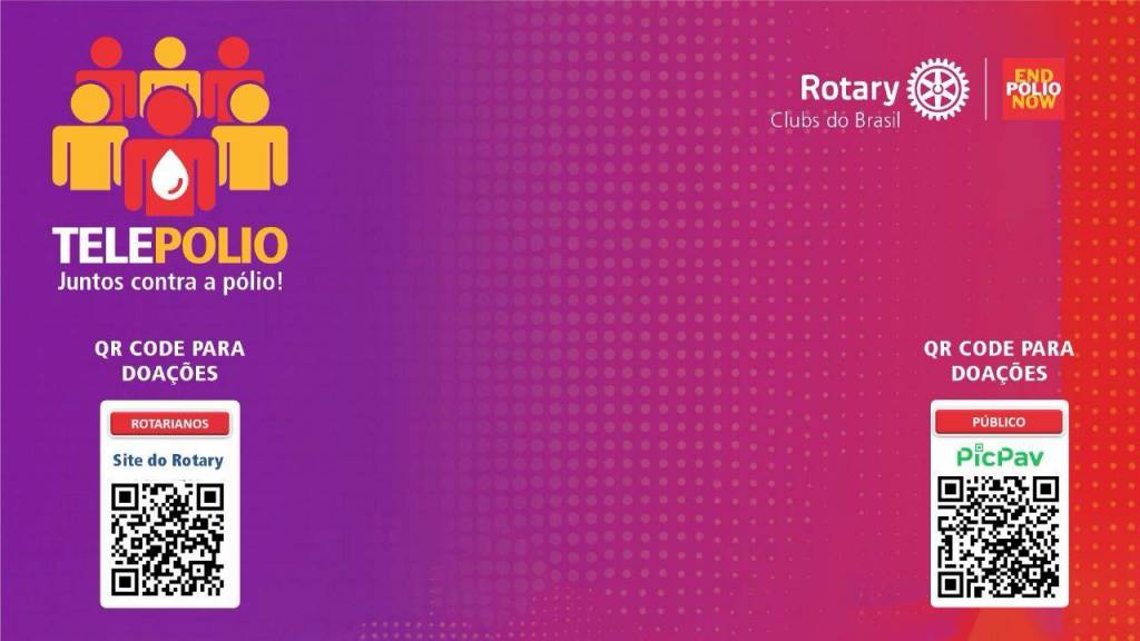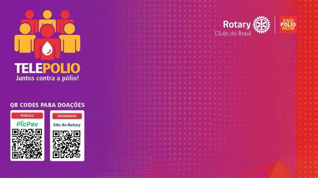 Audiodescrição: no card de fundo lilás em tons degradês, no título um destaque retangular com simbolo END POLIO NOW - TELEPOLIO, Juntos contra a pólio e desenho de bonecos em formato robô, nas cores amarelo e vermelho. Abaixo, 3 fotos de 3 pessoas em destaque, todos homens, quais sejam: da esquerda para direita, Gordon MCinally, Presidente Rotary International 2023-24, Henrique Vasconcelos, Mário Cesar Martins de Camargo. Ao lado, escrito: É HOJE DIA 23/10, Segunda-feira - 20h Horário de Brasília, símbolo do zoom., abaixo outras fotos identificadas, da esquerda para direita, Mike MC Govern, Carlos Sandoval Delgado, Marcelo Haick, Dr. Leonardo Weissman, Almiro Schimidt, Nestor Amarilo. Abaixo, mais fotos, com identificações da esquerda para direita, Dra. Ethel Leonor, Bruna Tinti, Mauricio de Souza, Dra. Ana Moura, Rafaela Spindler, Estela Aparecida Rodrigues Mendes, Dr. Ede Gatti. no centro, do lado esquerdo para o direito, símbolo do Rotary Club Brasil e do crie esperança no mundo. Abaixo, uma seta ligando Gesner Dias, Coordenador da Imagem Pública Região 31 a outra foto, escrito Apresentação Equipe de imagem publica do Brasil, e a foto do lado direito é de Carlos Daniel - Coordenador da imagem pública Região 29.