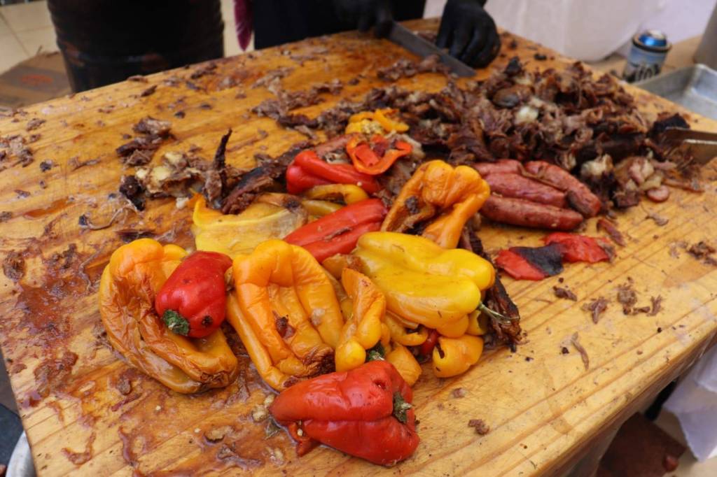 Audiodescrição: na foto, várias costelas de boi encaixadas em churrasqueiras de chão, sendo assadas, no chão, nota-se tocos de madeiras queimando em forma de carvão.