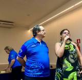 Audiodescrição: na foto, 5 pessoas identificadas, da direita para esquerda, uma jovem, de cabelos amarrados, castanhos, usa blusa amarela, saia jeans, sorridente, do seu lado, um senhor de cabelos castanhos, usa óculos, camiseta azul com símbolo do Rotary, sorri discretamente, ao seu lado, uma senhora loira, com óculos em cima da cabeça, usa camiseta azul com símbolo do Rotary, ao seu lado, uma jovem, de cabelos loiros, amarrados, usa óculos, vestido estampado, sorridente, e o seu lado, uma senhora de cabelos castanhos, usando óculos, vestido jeans, sorri discretamente.