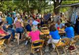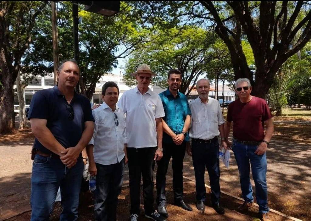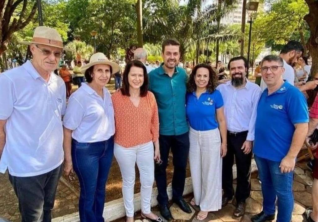 Audiodescrição: na foto, 15 pessoas identificas, entre elas, pessoas vestidas de jaleco branco, e o Casal Governador Rita e Pavam. Todos posam pra foto sorridentes. No fundo, arvores e grama, parece ser uma praça.