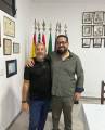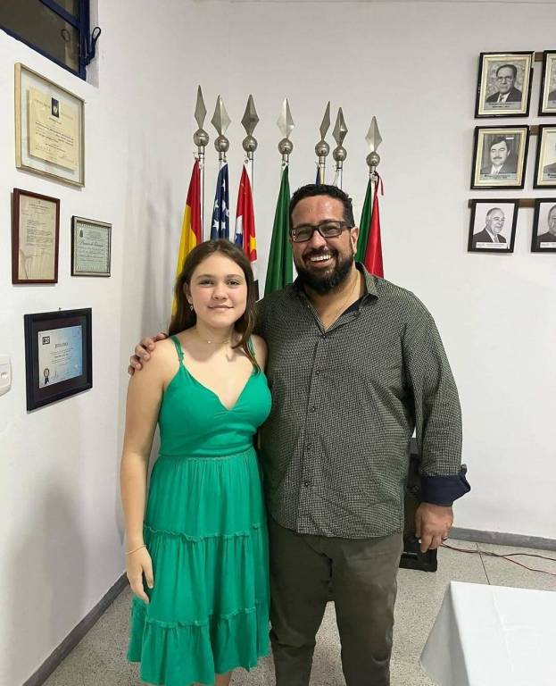 Audiodescrição: na foto, duas pessoas identificadas, do lado direito para o esquerdo, uma jovem, de cabelos longos retos, usando vestido azul, sorridente, abraça um rapaz, do seu lado esquerdo, sorridente, usa camisa verde e calça creme, cabelos e barba castanhos, usa óculos. Atrás, identifica-se o pavilhão de bandeiras e do lado direito da foto, o topo de uma cadeira de madeira.