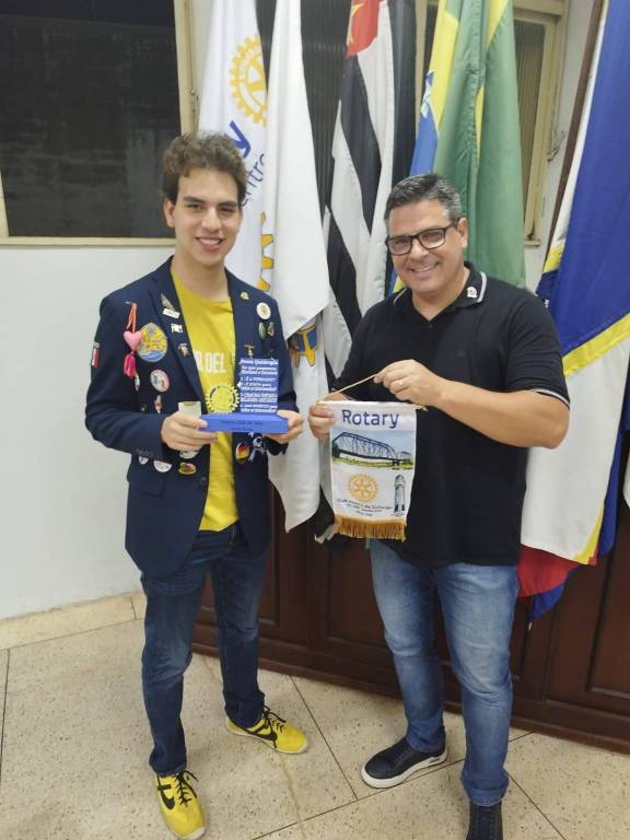 Audiodescrição: na foto, duas pessoas identificadas, do lado direito um rapaz, de cabelos castanhos, usando óculos, segura uma plaquinha com símbolo do Rotary nas mãos, do seu lado, um jovem, de cabelos castanhos, sorridente, usa paletó azul marinho com vários bótons, segura uma flâmula do Rotary. Atrás de ambos, o pavilhão de bandeiras.