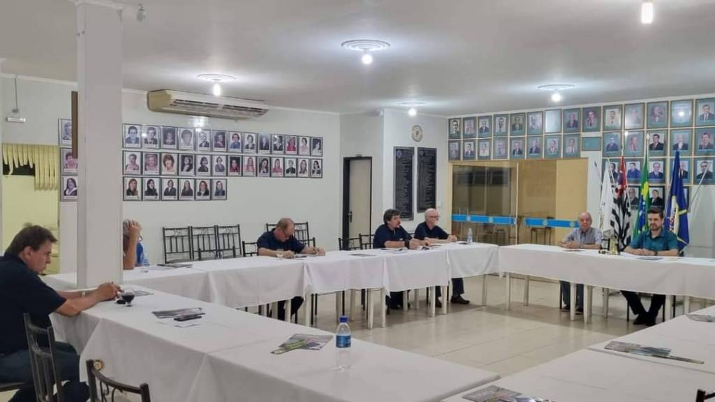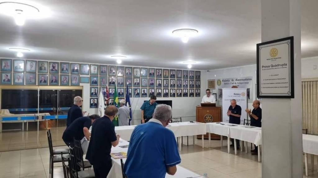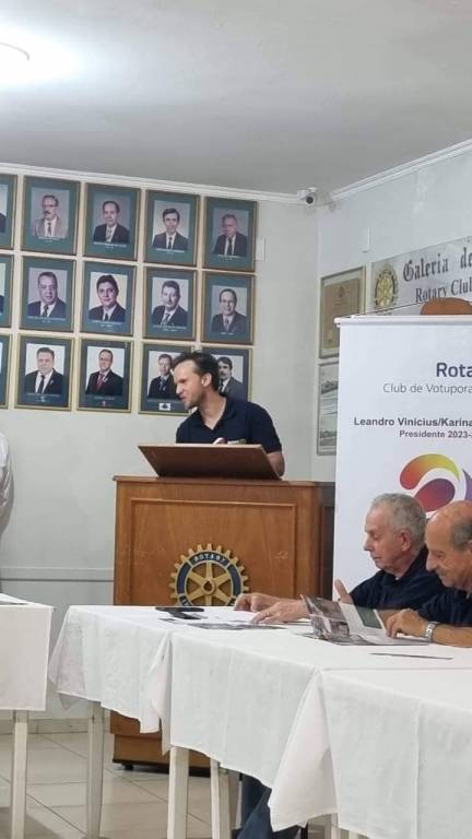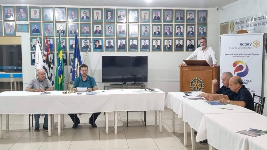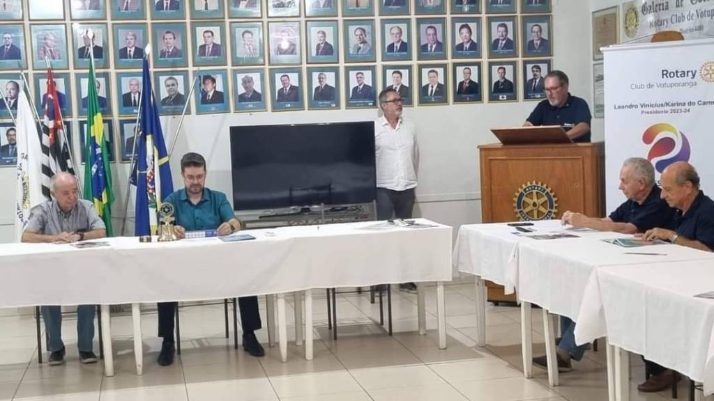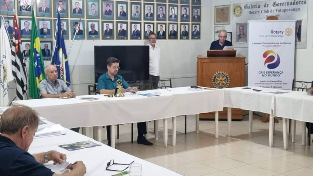 Audiodescrição: na foto, umas mesas em formato L, com toalhas brancas, do lado direito, dois senhores sentados com as mãos em cima da mesa, mexendo em algum papel. Do lado esquerdo, um rapaz sentado, com a mão na mesa, tem um papel na mão direita e leva a mão esquerda no rosto, usa óculos. Do seu lado, um sino em cima da mesa. Atrás das mesas, uma televisão desligada, identificação de canto esquerdo de uma bandeira - do pavilhão - atrás, na parede, fotos de antigos residentes e entre as mesas, uma tribuna, de madeira, com roda rotária no centro, um senhor cabelos castanhos, usando óculos, fala com a mãos em cima da tribuna e ao seu lado, em pé, um senhor que usa camisa branca, calça jeans, óculos, olhando para o senhor da tribuna. Do lado da tribuna e atrás dos dois primeiros senhores, um banner, com símbolo do Rotary Club de Votuporanga e no centro desenho do lema crie esperança no mundo.