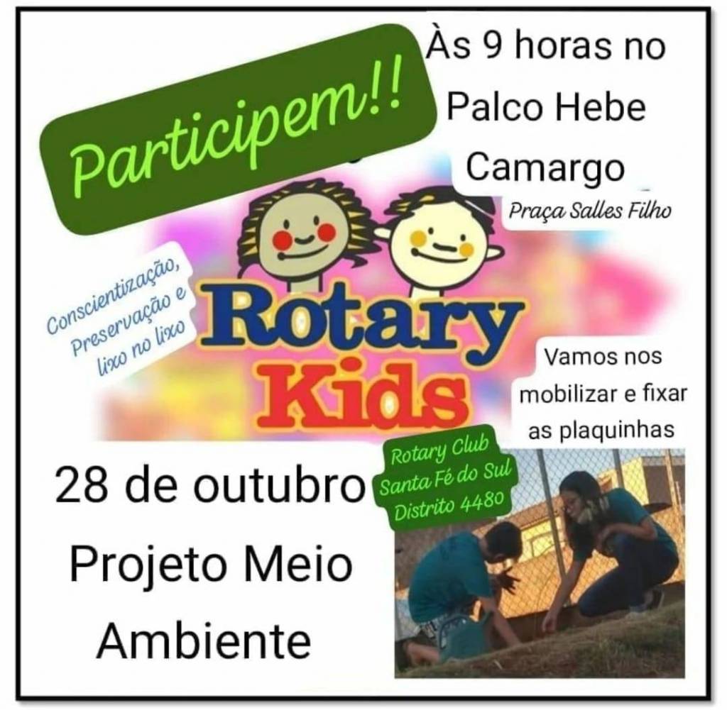 No sábado 28 de outubro, o Rotary Kids de Santa Fé do Sul irá realizar uma ação ambiental. Serão instaladas placas com frases de conscientização, que foram elaboradas pelos kidianos. As placas serão instaladas nos canteiros centrais da cidade.