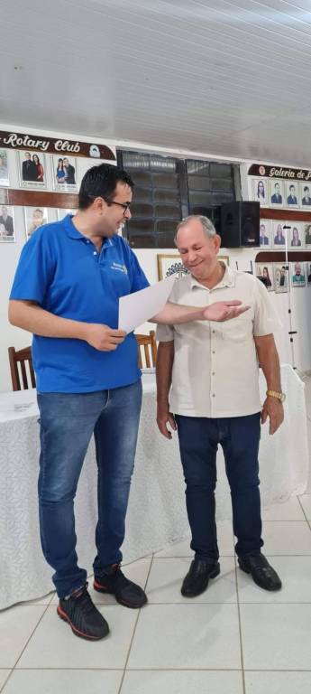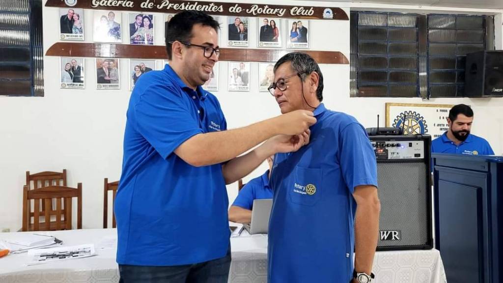 Audiodescrição: na foto, 3 homens identificados, do lado direito para o esquerdo, um homem alto, cabelos castanhos, usando óculos, camiseta azul royal com símbolo do Rotary. E calça jeans. Do seu lado, um senhor de cabelos grisalhos, usando óculos, camiseta azul royal, com símbolo do rotary, e calça jeans. Do seu lado, um senhor de cabelos brancos meio calvo. Usa óculos, camiseta branca, com símbolo do rotary, e calça jeans. Sorridente. Todos se abraçam. Ao fundo se identifica uma mesa com toalha rendada branca e na parede uma galeria de foto de presidentes.