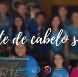 Audiodescrição: na foto, vários jovens identificados, eles sorriem e posam pra foto. Alguns em pé outros agachados. Vestem camisetas azul e outros rosa. Dois dos jovens seguram na frente um cartaz : 5 corte de cabelo solidário. Ao fundo observa-se um ambiente com teto em madeira, e pilares de tijolinho.