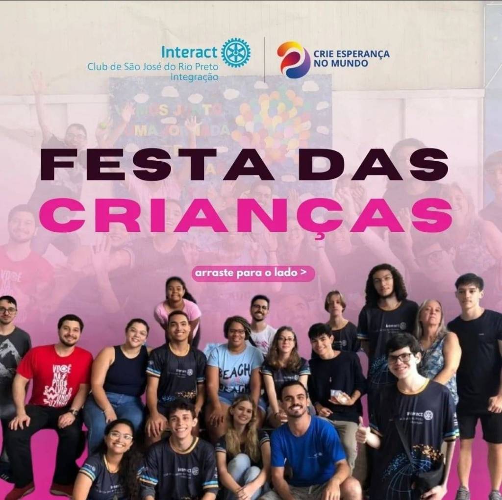 Varías pessoas entre homens e mulheres jovens e sorridentes, alguns sentados e outros de pé estão à frente de um grande painel em tons de rosa e com imagem de pessoas desfocadas ao fundo . Acima o símbolo do Interact Club de São José do Rio Preto Integração e ao lado o lema da gestão atual . Abaixo em letras grandes: Festa das crianças .