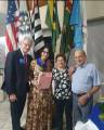 O casal Gov. Rita e Pavam estão acompanhados de 3 homens e 2 mulheres em cima de um tablado, localizado sobre um gramado com um marco rotário. O espaço é aberto e bem iluminado.