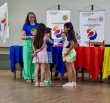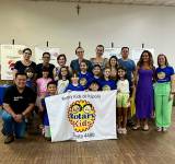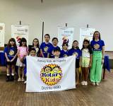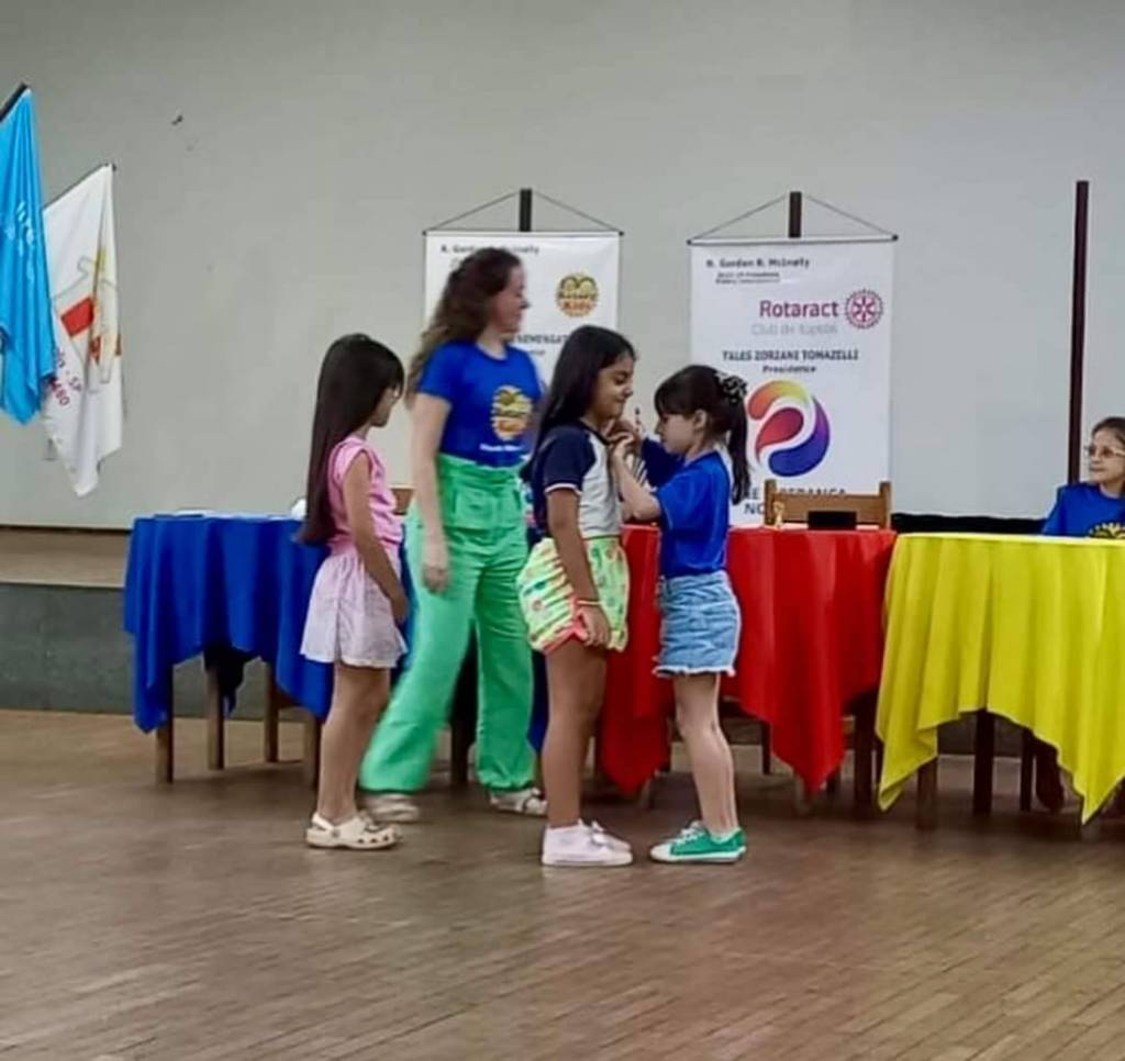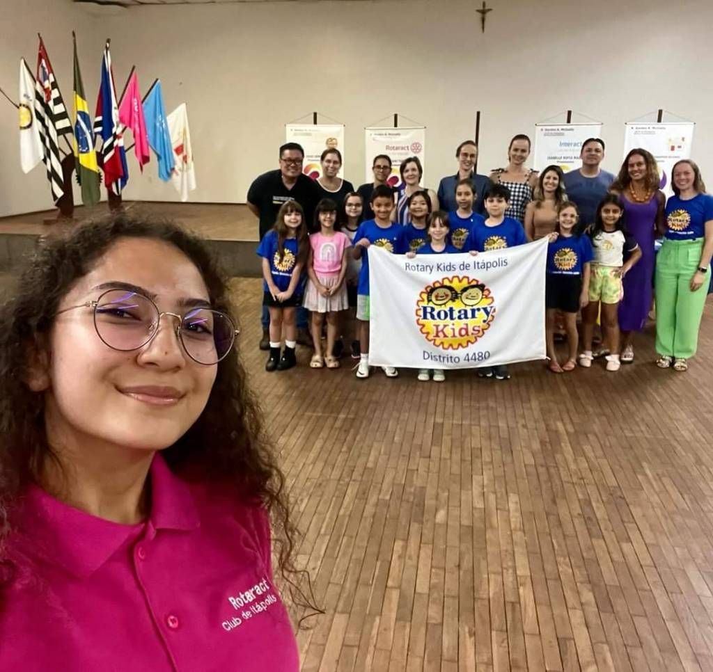 Audiodescrição: na foto, 10 crianças identificadas, posicionadas para foto, e ao lado uma jovem. Todos sorriem, as crianças seguram uma faixa branca, com símbolo do Rotary kids de Itápolis Distrito 4480. Ao fundo, alguns banners com símbolo do lema crie esperança no mundo e do Rotaract, do Interact e da Casa da Amizade, todo de Itápolis.