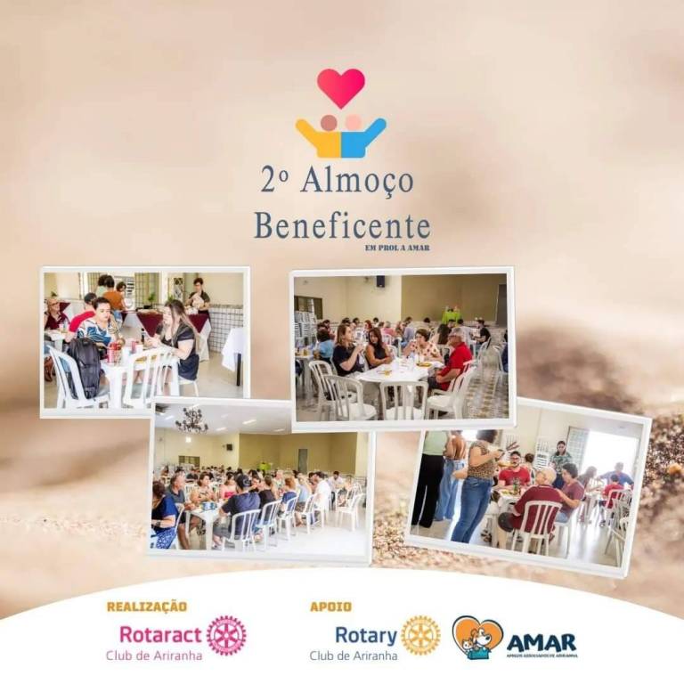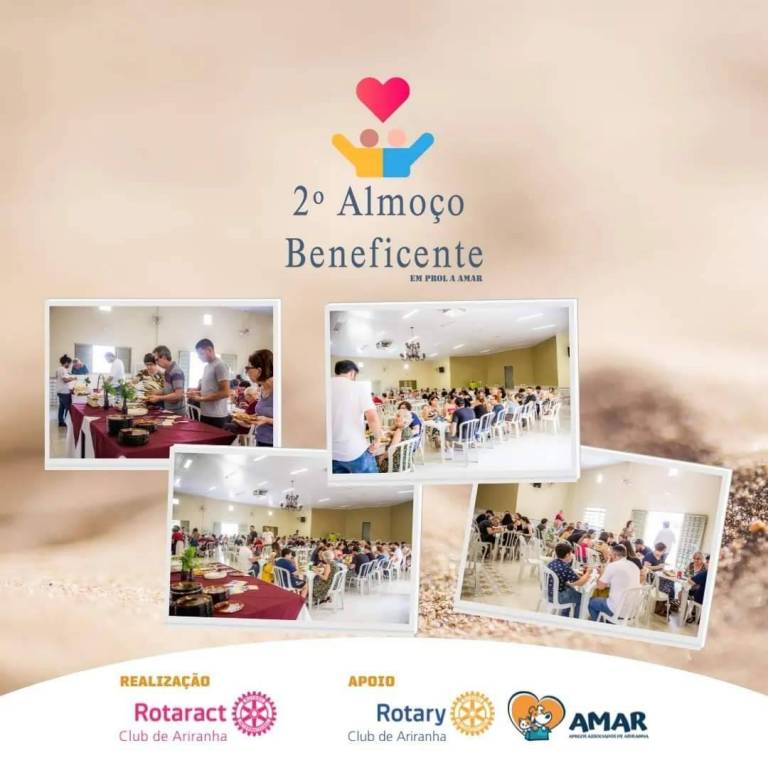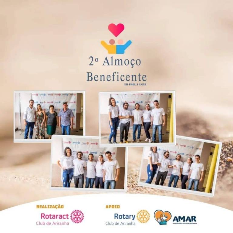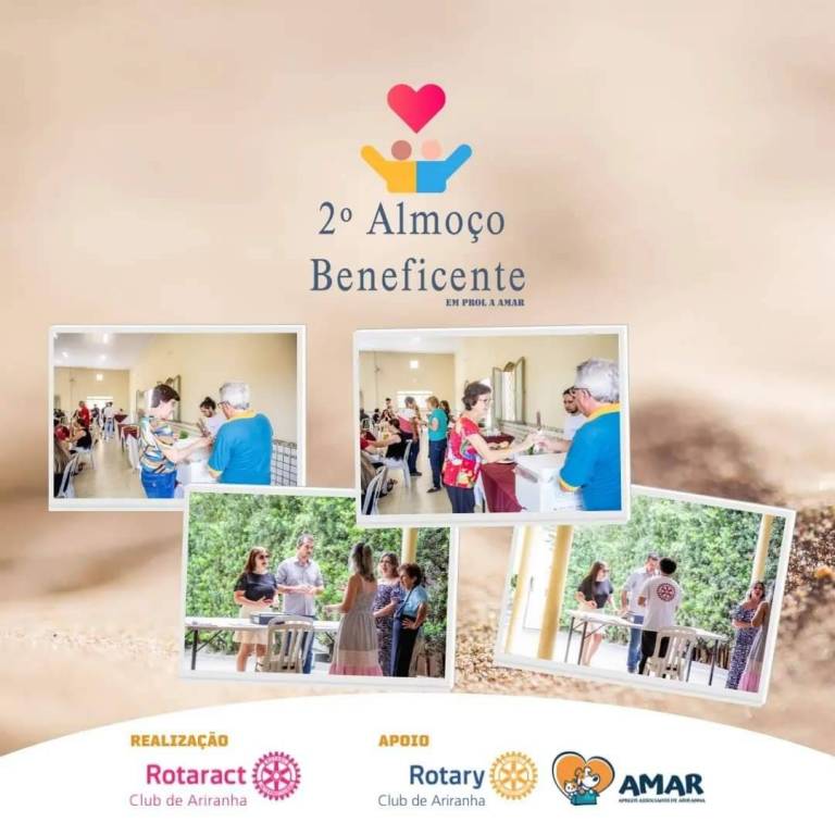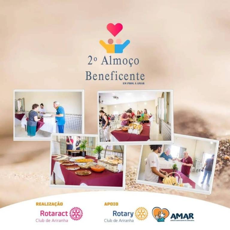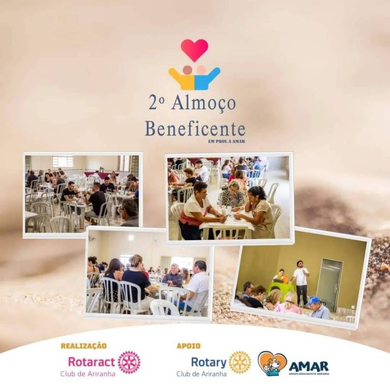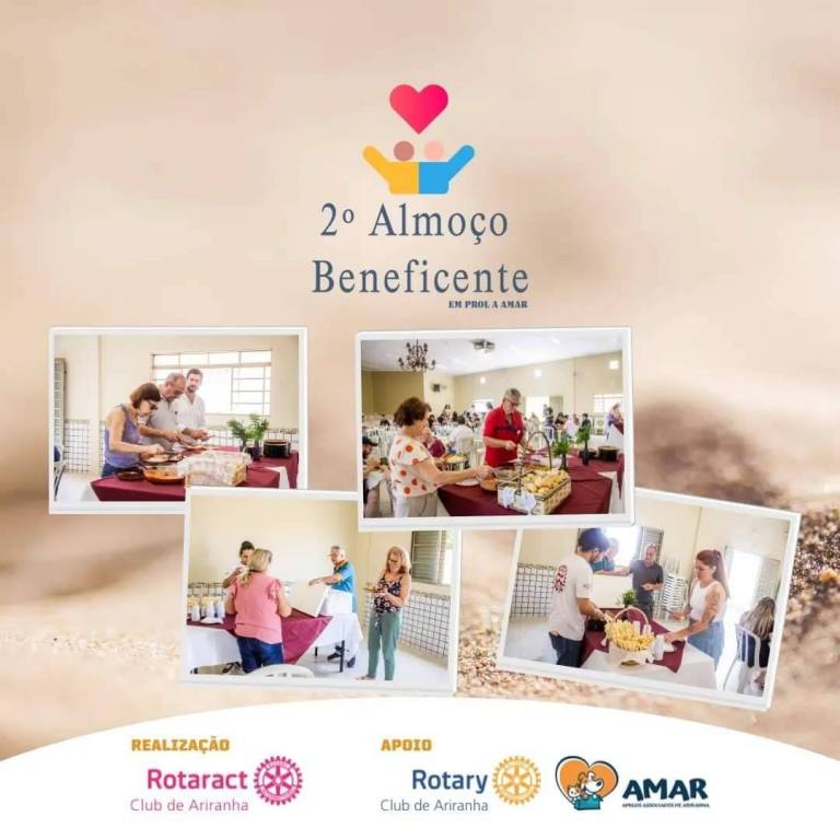 Abaixo, 4 fotos espalhadas no card, de pessoas e momentos do almoço. Pessoas identificadas sorriem. No rodapé, Realização Rotaract Club de Ariranha e Apoio Rotary Club de Ariranha e AMAR.