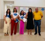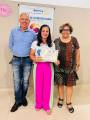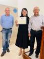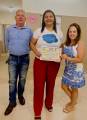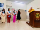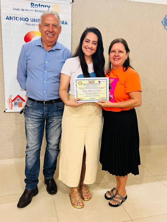 Audiodescrição: na foto 8 pessoas identificadas, entre homens e mulheres, todos sorridentes, as mulheres seguram uma espécie de certificado. No fundo, um banner com símbolo do Rotary Club de Monte Aprazível, com a descrição do presidente Antonio Umberto Vieira, e lema do crie esperança no mundo.