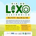 1 card azul claro barrado em tons de verde e com letras verde escuro em destaque no alto: Dia do Lixo eletrônico - destacando a letra i em formato de lâmpada florescente e a letra o em florescente redonda. Abaixo a data e hora: dia 11/11 das 8h as 13 h .