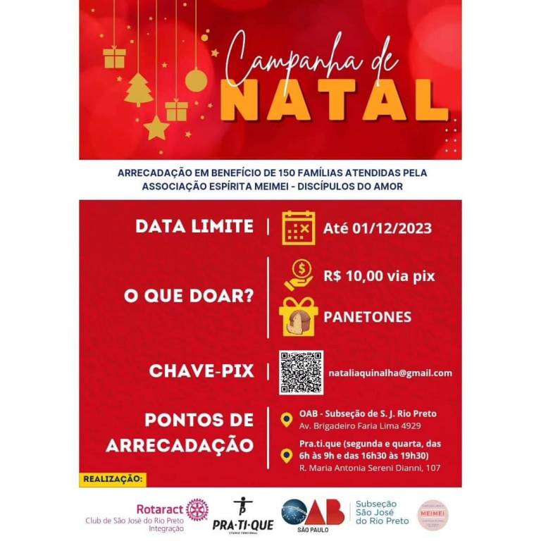 Até 01/12/23, você pode contribuir entregando um panetone (ou mais), ou fazendo uma doação em dinheiro via Pix (chave: [email protected]).