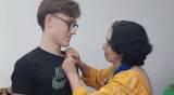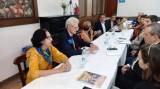 5 pessoas detectadas em um salão branco na frente de algumas mesas com toalhas brancas. Do lado esquerdo está o Gov. Pavam, homem magro, grisalho e alto com um terno preto, ao lado de sua esposa Rita, cabelos escuros com um vestido laranja e um lenço azul no pescoço. Ao centro, uma mulher com uma saia na altura dos joelhos na cor creme e uma camisa sem mangas, com cabelos curtos escuros. Ao seu lado, uma mulher de óculos e cabelos castanhos volumosos, veste calça preta e uma camisa florida em tons discretos de vermelho. Na ponta direita está um homem grisalho com cabelos penteados para trás, veste um terno preto. Ao fundo há uma projeção na parede no canto superior direito, ao centro no fundo há uma coluna circular e ao fundo do lado esquerdo, atrás do pavam, o banner da gestão e bandeiras penduradas em pavilhões.