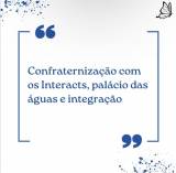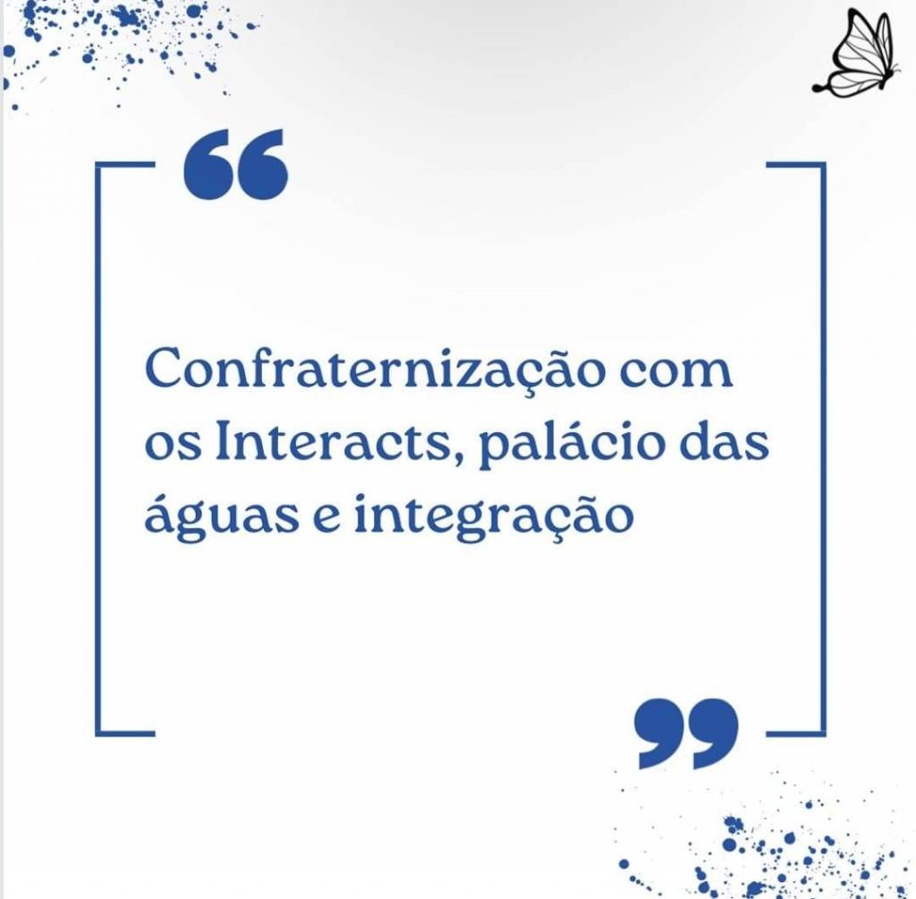 Card branco com pingos de tinta azul marinho na lateral esquerda acima e lateral direita abaixo. Na lateral direita acima uma borboleta voando. No centro os dizeres:confraternização com os Interacts, Palácio das Águas e Integração em letras azul marinho, circundado por uma linha aberta acima e abaixo acompanhada de aspas.