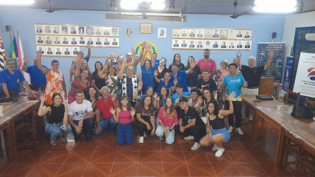 Várias pessoas entre homens e mulheres de idades diferentes, estão de pé, uns com braços erguidos e outros agachados e ajoelhados à frente de uma parede azul clara com a roda rotária ao centro e varias fotos formando uma galeria. O ambiente é fechado, bem iluminado, com mesas de madeira nas laterais e banners rotários bem como um pavilhão de bandeiras ao fundo na esquerda da sala.