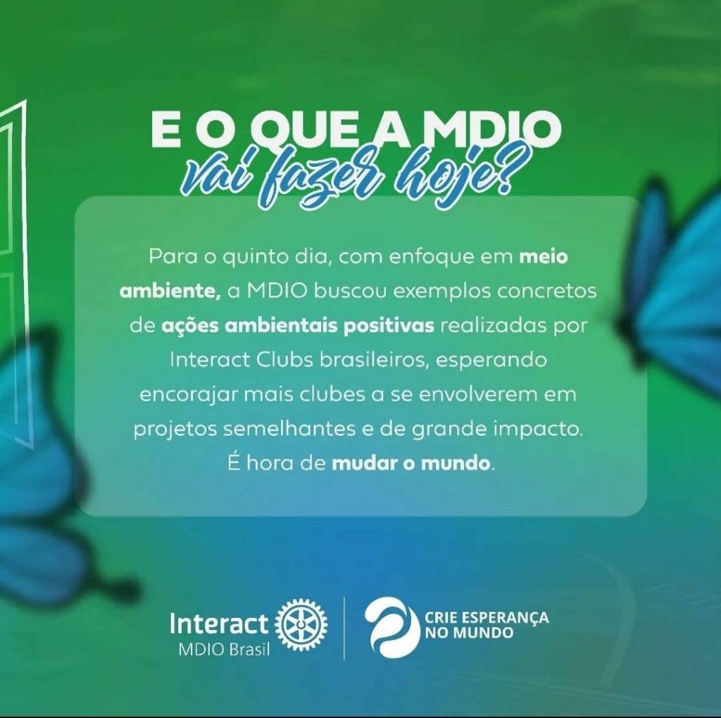 No quinto dia da Semana Mundial do Interact (SMI) dedicado ao meio ambiente, a MDIO Interact Brasil se orgulha em destacar ações de clubes de todo o Brasil que foram de enorme relevância e significado. Essas iniciativas não apenas buscaram fazer a diferença, mas também trouxeram resultados significativos para suas comunidades e para o meio ambiente. Estamos inspirados por essas realizações e ansiosos para continuar esse importante trabalho juntos! Que essas ações sirvam como inspiração para outros clubes, incentivando-os a fazer a diferença em suas próprias comunidades. #SMI #MeioAmbiente #InteractBrasil