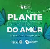 #ParaTodosVerem: A imagem apresenta um fundo com um degradê de cores, que transita do verde para o azul. No centro, encontra-se a palavra "PLANTE" escrita em uma fonte de cor branca. Abaixo, está escrito "SEMENTES" em uma fonte com efeito vazado e na cor branca. Logo abaixo, temos a frase "DO AMOR" também em branco. Na parte inferior, encontra-se a frase "Proposta para Meio Ambiente", escrita em uma fonte fina na cor branca. Nos lados direito e esquerdo da imagem, há algumas borboletas azuis desfocadas. No fundo, há um elemento de janela na cor branca. Acima, está presente a logo da 61ª Semana Mundial do Interact, seguida pelas logos da MDIO Interact Brasil e do lema rotário 2023-24, todas em branco.