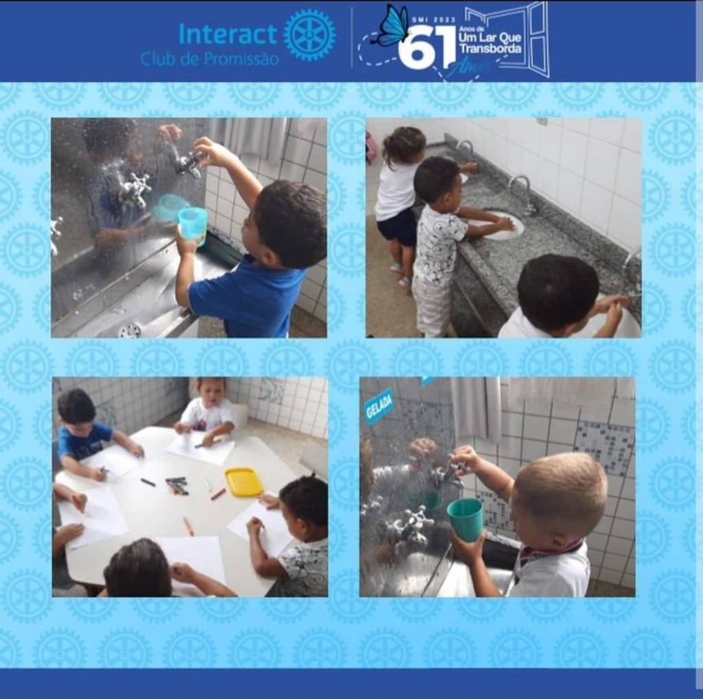 • As crianças da Ceim Emei Jardim Pevi da cidade de Penápolis, da educadora Adriana Chon realizaram a atividade do 5° dia da Semana Mundial do Interact, o não desperdício da água, onde fizeram um passeio na área interna da creche, foram ao bebedouro e chuveiro. Em seguida, tia da limpeza explicou como poderiam economizar água, e demonstrou isso lavando o corredor da escola com água no balde.