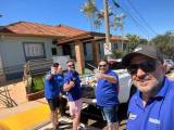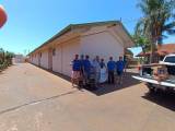 Audiodescrição: na foto, 9 pessoas identificadas, das quais, a do canto direito e uma mulher e do canto esquerdo uma mulher também, os demais, todos homens. Ao centro, dois dos homens seguram uma faixa branca, com o símbolo do Rotary Club de Barra Bonita Distrito 4480. Ao lado da mulher identificada na direita da foto, observa-se um carrinho de supermercado.