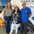 Atrás das pessoas tem um grande painel claro com um triângulo trazendo a logo do Fundo Socila de Santa Fé do Sul. O lugar é fechado e iluminado.