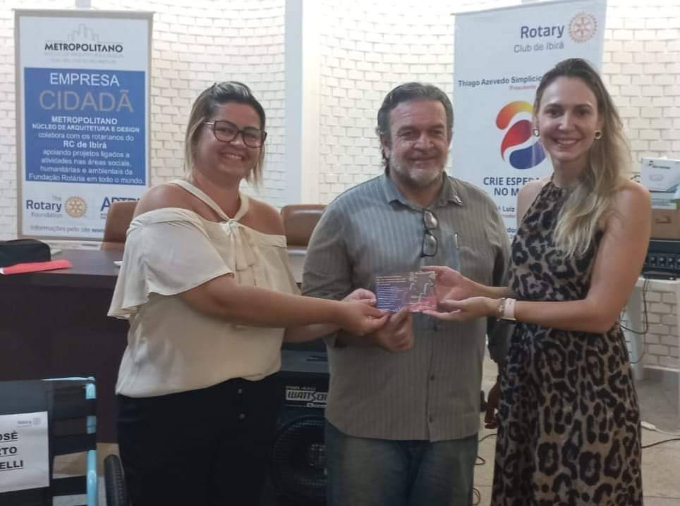 Audiodescrição: na foto, lado esquerdo, três pessoas identificadas, lado a lado, no centro um homem e dos lados mulheres, os 3 seguram algo nas mãos, no lado direito, mais duas pessoas identificadas, atras e um tribuna uma mulher, do seu lado um rapaz, ela segura um microfone e ele uma pasta, atras dele tem uma caixa de controle de som e ao lado da caixa um banner com identificação do Rotary de Ibirá bem como do lema crie esperança no mundo. Na frente da foto, uma cadeira de rodas.