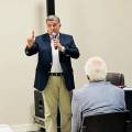 Audiodescrição: na foto, 5 homens identificados, lado a lado, todos em pé, usando terno, o segundo da esquerda pra direita fala ao microfone e aponta o dedo para o lado. Os demais olham pra frente e para o que está falando. Todos aparentam ter meia idade.