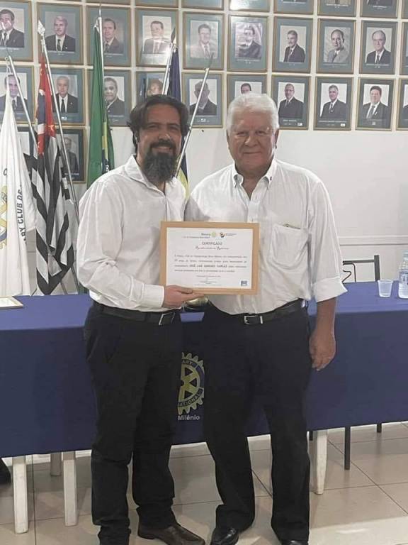 Audiodescrição: na foto, duas pessoas identificadas, lado a lado, lado direito, um senhor de cabelos brancos, usa camisa social e calça, do lado esquerdo um rapaz de cabelos pretos e barba grisalha, usa camisa social e calça, ambos seguram um quadro de certificado, atrás deles uma mesa com toalha azul e roda rotária no meio desenhada, atrás da mesa, o pavilhão de bandeiras e na parede fotos de antigos presidentes.