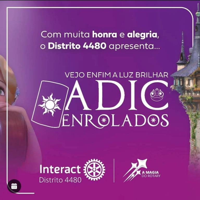 Arrastando para o lado, temos a logo do evento, acima de tudo isso temos "Com muita honra e alegria o Distrito 4480 apresenta...". Ao lado esquerdo, temos a imagem da torre da Rapunzel.