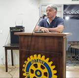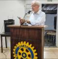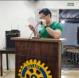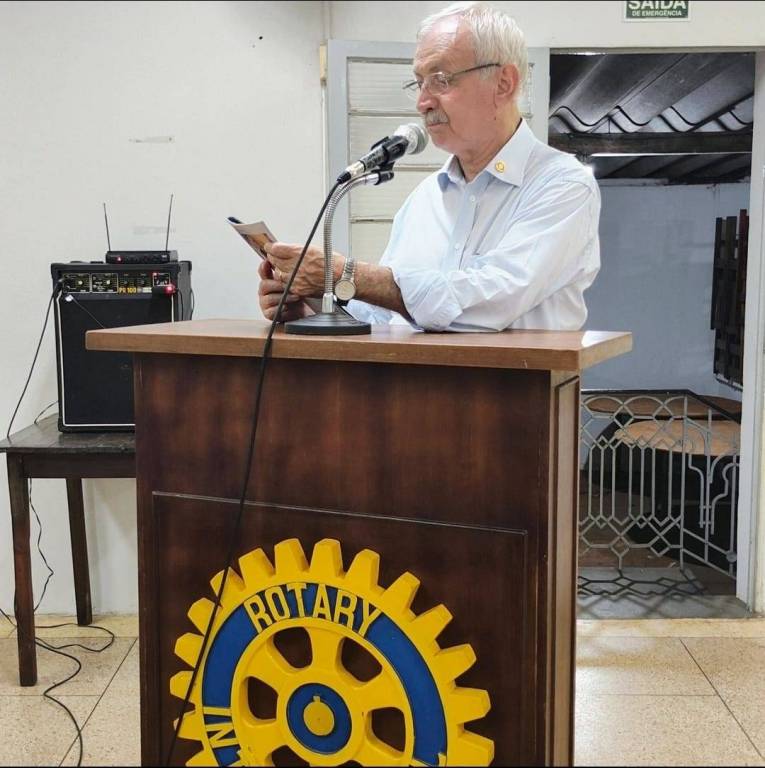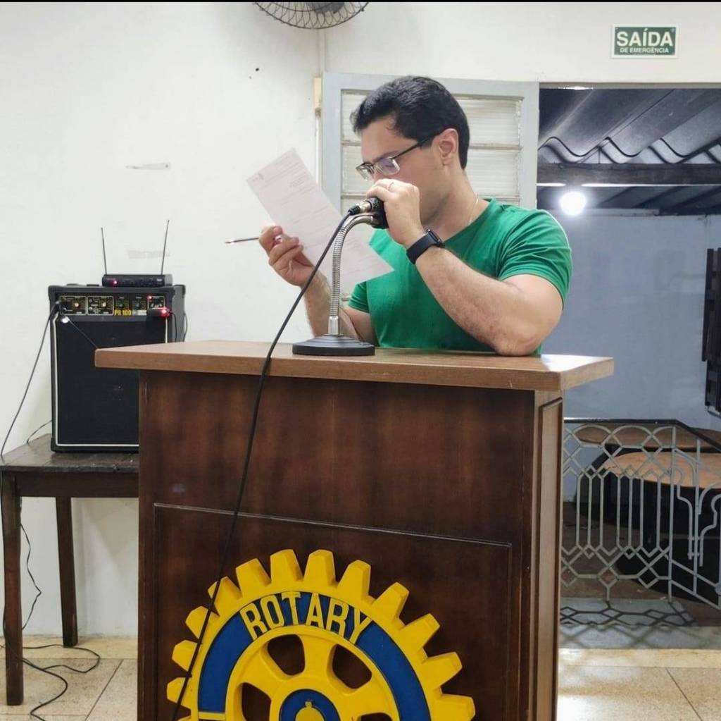 Audiodescrição: na foto, uma tribuna de madeira com simbolo da roda rotária no centro, Em cima da tribuna um microfone, e, atrás dele um rapaz falando, segura um livro, tem cabelos grisalhos e usa camiseta preta, atrás dele, uma porta aberta e uma caixa de som.