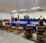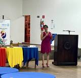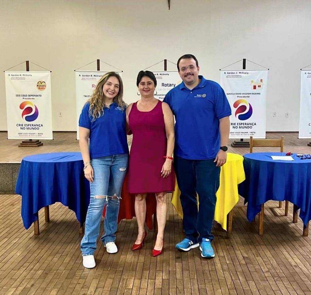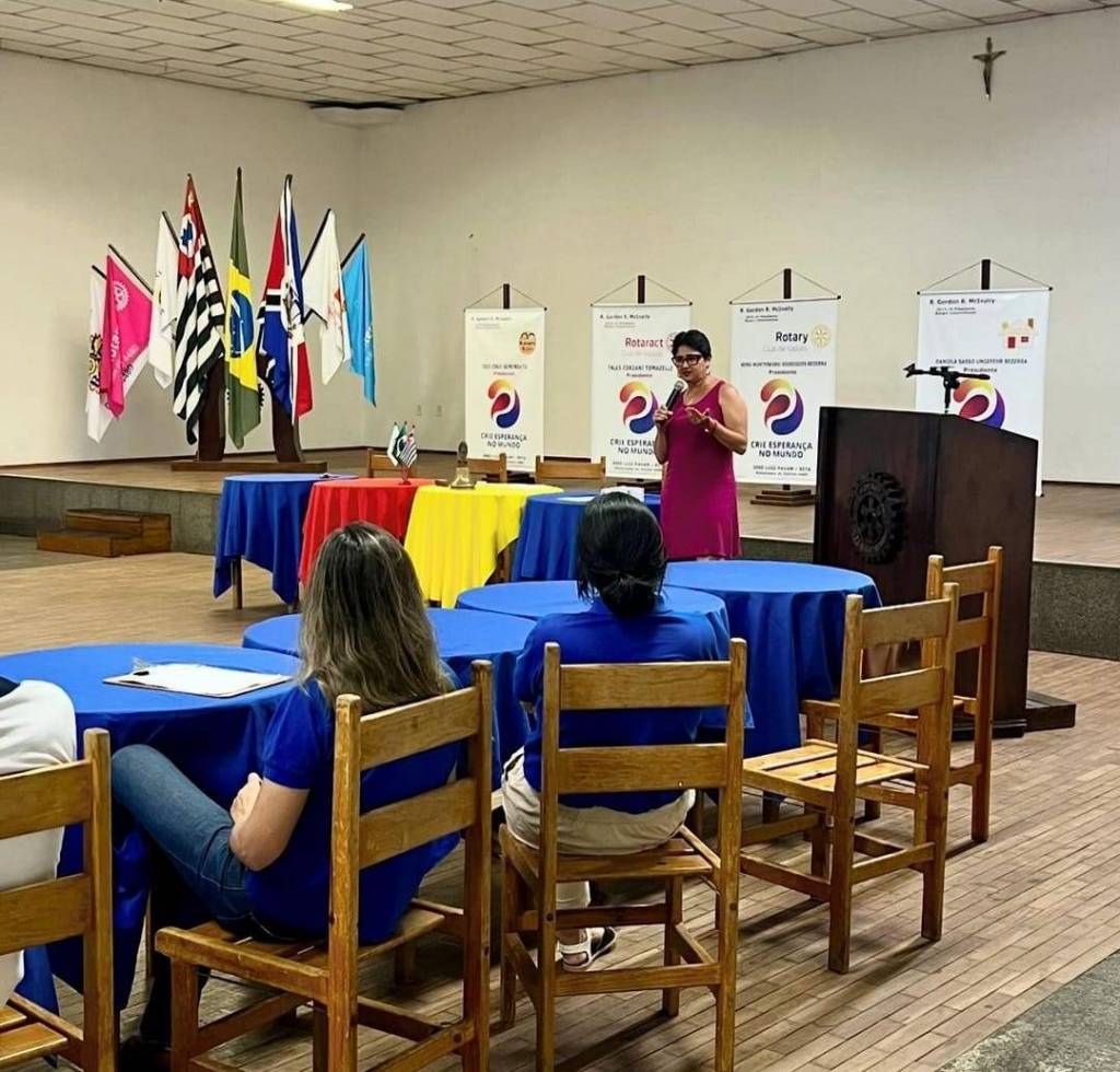 Audiodescrição: na foto, ao fundo, vários banners com simbolos Rotary, Rotaract, do lema crie esperança no mundo. Na frente, lado direito, uma tribuna de madeira com roda rotária no centro, lado esquerdo mesas com toalhas azul e amarela, sino rotário em cima da mesa. Entre a tribuna e as mesas uma mulher em pé, usando um vestido pink, cabelos pretos curto, usa óculos, e fala ao microfone. Na frente dela, outras mesas com toalhas azul e uma jovem sentada de costas para a foto de cabelo preto, amarrado.