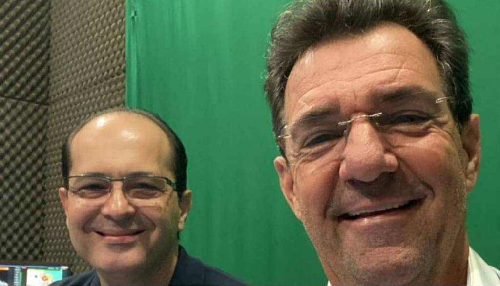 Audiodescrição: no card, duas fotos separadas, uma em cima outra embaixo, a de cima dois homens, cada um sentado em frente a um microfone, atras deles 12horas por alguem, desenho de um coração e duas mãos segurando o coração, uma em cima e outra embaixo, do lado um sino dourado com o numero 1 em destaque, abaixo, na outra foto, 4 pessoas identificadas, fazem um selfie, no meio deles uma mesa, com uma biblia m cima, garrafa de água, telefone e uma bolsa de mulher.