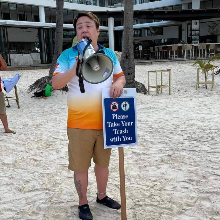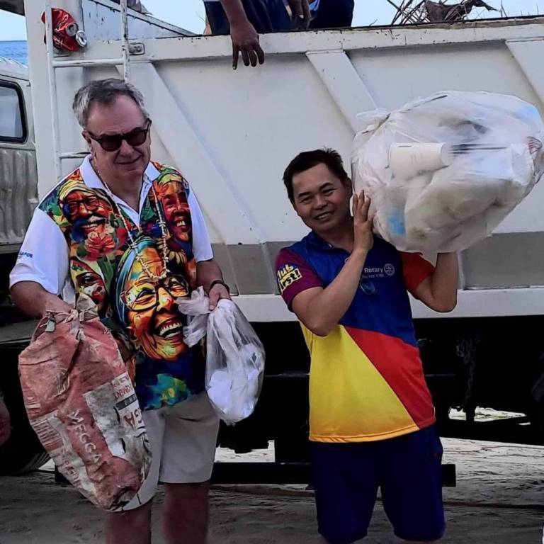 "À medida que viajo ao redor do 'mundo Rotary', gosto de tudo o que faço, mas aprecio particularmente a oportunidade de fazer o serviço. Uma dessas oportunidades surgiu recentemente (02/03), quando participei de uma limpeza de área costeira junto com membros do distrito 3780 do Rotary e a polícia local da ilha de Boracay, nas Filipinas. 56 sacos de lixo com resíduos descartados foram recolhidos para melhorar o ambiente de uma bela praia." — Gordon McInally