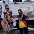 Na foto 2 homens identificados:o da esquerda veste camiseta de mangas brancas com estampa bem colorida na frente de vários rostos sorrindo, está de bermuda clara, usa óculos de sol e tem um colar de contas no pescoço e trás nas mãos sacos: um de papel e outro de plástico. O da direita tem traços orientais e está vestindo bermuda escura e camiseta do Rotary em 3 cores: amarelo, vermelho e azul.