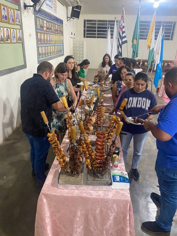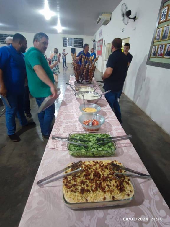 A foto foi tirada em um lugar fechado, iluminado por lâmpadas de teto e trás várias mesas perfiladas com toalhas rosa e cadeiras brancas. Observamos várias pessoas entre homem e mulheres sentados se alimentando . Nas mesas existem vasinhos de flores pequenas brancas, garrafas e vários alimentos. Ao fundo temos do lado esquerdo para o direito, um pavilhão com suas bandeiras, uma mesa redonda e um painel de parede cobertos com toalhas rosa clara, banner da gestão atual, uma tribuna azul e um banner da Empresa Cidadã. Janelas de ferro grande estão ao alto da parede do fundo. Ainda ao fundo, temos uma lousa na parede com um extintor a seu lado e acima dela a prova quádrupla em letras pretas em um painel claro. Seguindo um outro banner da Pólio . Do lado direito temos uma parede clara com uma grande porta de vidro fume com uma cortina de ar acima e um ventilador de parede bem ao lado da porta. Observamos uma criança tentando abrir a porta.